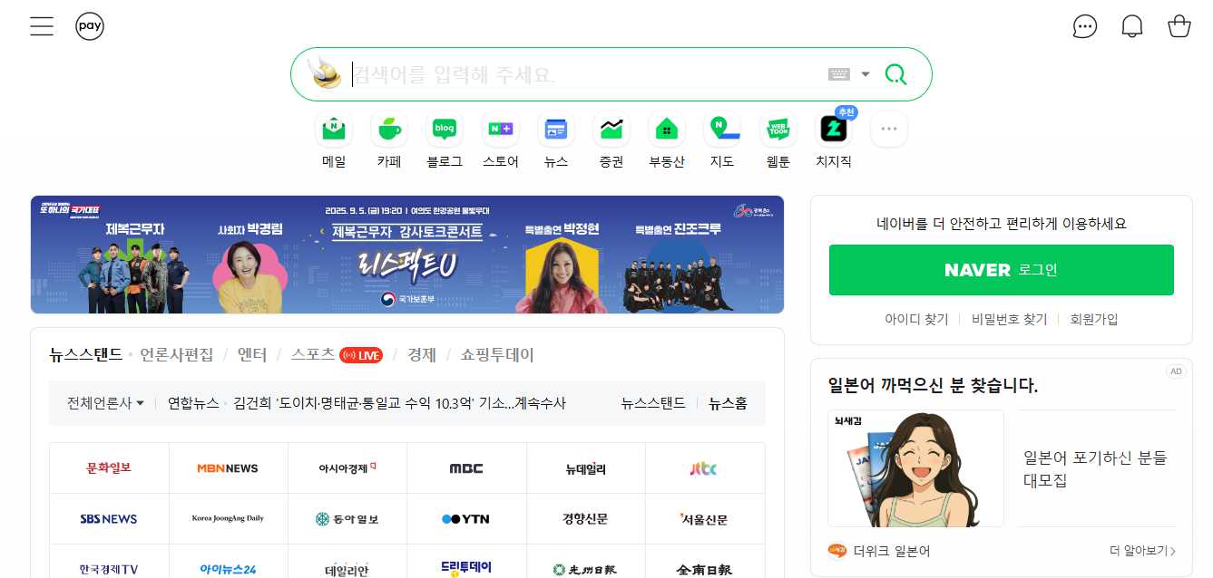 네이버 메인 페이지에서는 주요 서비스로의 직접 바로가기를 제공합니다 :